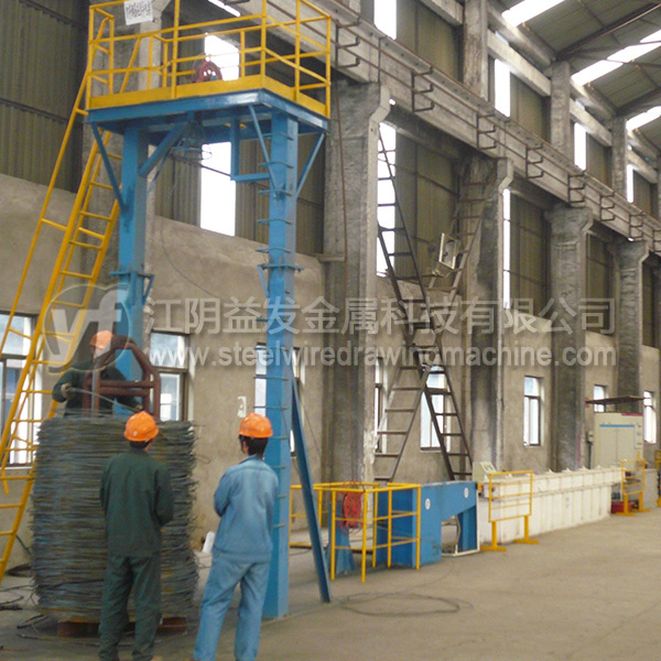 放線架是將原料無動(dòng)力(被動(dòng)放出),粗線(?8mm)以上通常采用“一”字式放線架,優(yōu)點(diǎn)在于放線不停車、操作高度較低比較安全。中線(≤6.5mm)推薦采用液壓式高架放線,優(yōu)點(diǎn)在于節(jié)約場(chǎng)地、放線不停車、高度達(dá)到9米以上時(shí)亂絲非常少;但是對(duì)于這個(gè)直徑的高碳鋼絲而言,鴨嘴式放線架雖然使用場(chǎng)地比較大,效果也可以的。細(xì)絲的放線一般用上抽式放線架,尤其對(duì)于退火后的細(xì)絲,就必須使用一些特殊的裝置才能確保亂絲少。工字輪放線是*好的方式,但是因?yàn)橛猛镜南拗疲@種方式不能全部使用。